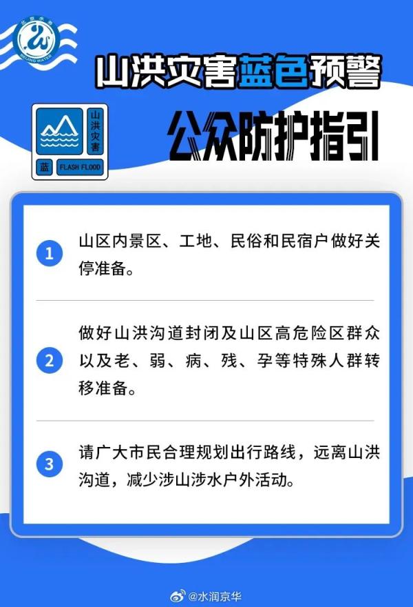 2025年8月2日9时40分,区气象局发布暴雨蓝色预警信号。经水文分析研判,当前山区土壤含水率饱和度高,处于易产流状态,基于未来降水的不确定性,预计未来24小时,我区流村镇、阳坊镇、南口镇、十三陵镇、延寿镇、兴寿镇、崔村镇等山区存在山洪风险,涉及7个山区镇83个险村。请做好实时监测、预警叫应、山洪沟道管理、避险转移等防范工作。